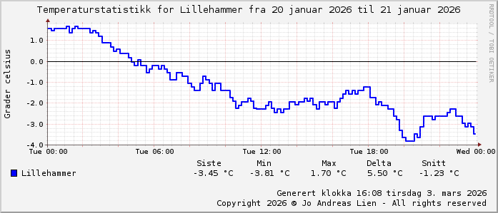 MinTemp -3.8°C (20:35) MaxTemp 1.7°C (01:15) MiddelTemperatur -1.1°C GjennomsnittsTemp -1.2°C (143 avlesninger) Målt på Lillehammer av joli Navnedag: Fabian, Sebastian, Bastian Stjernetegnet er ![]() Kinesisk år er