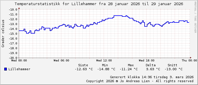 MinTemp -14.9°C (01:15) MaxTemp -11.2°C (13:35) MiddelTemperatur -13.1°C GjennomsnittsTemp -7°C (143 avlesninger) Målt på Lillehammer av joli Navnedag: Karl, Karoline Stjernetegnet er Vannmannen ![]() Kinesisk år er