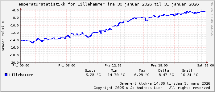 MinTemp -14.7°C (01:45) MaxTemp -6.2°C (21:45) MiddelTemperatur -10.5°C GjennomsnittsTemp -7°C (143 avlesninger) Målt på Lillehammer av joli Navnedag: Gunda, Gunhild Stjernetegnet er Vannmannen ![]() Kinesisk år er
