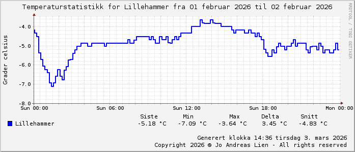 MinTemp -7.1°C (01:35) MaxTemp -3.6°C (13:15) MiddelTemperatur -5.4°C GjennomsnittsTemp -4.8°C (143 avlesninger) Målt på Lillehammer av joli Navnedag: Birte, Bjarte Stjernetegnet er Vannmannen ![]() Kinesisk år er