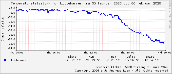 MinTemp -21.6°C (23:45) MaxTemp -6.2°C (03:25) MiddelTemperatur -13.9°C GjennomsnittsTemp -7°C (143 avlesninger) Målt på Lillehammer av joli Navnedag: Agule, Ã…got Stjernetegnet er Vannmannen ![]() Kinesisk år er