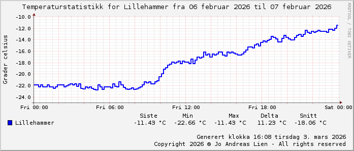 MinTemp -22.7°C (04:55) MaxTemp -11.9°C (23:55) MiddelTemperatur -17.3°C GjennomsnittsTemp -7°C (143 avlesninger) Målt på Lillehammer av joli Navnedag: Dorte, Dortea Stjernetegnet er Vannmannen ![]() Kinesisk år er