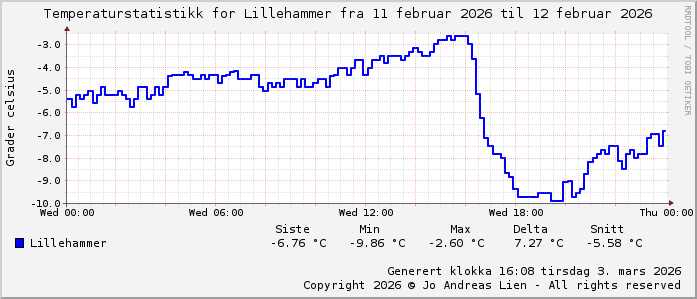 MinTemp -9.9°C (19:35) MaxTemp -2.6°C (16:05) MiddelTemperatur -6.3°C GjennomsnittsTemp -5.6°C (143 avlesninger) Målt på Lillehammer av joli Navnedag: Ingve, Yngve Stjernetegnet er Vannmannen ![]() Kinesisk år er