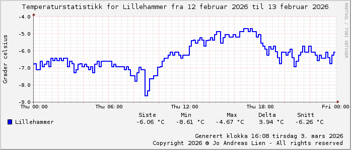 MinTemp -8.7°C (09:05) MaxTemp -4.7°C (17:25) MiddelTemperatur -6.7°C GjennomsnittsTemp -6.3°C (143 avlesninger) Målt på Lillehammer av joli Navnedag: Randi, Randulf, Ronja Stjernetegnet er Vannmannen ![]() Kinesisk år er