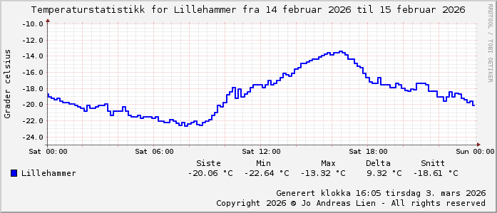 MinTemp -22.7°C (07:55) MaxTemp -13.3°C (16:35) MiddelTemperatur -18°C GjennomsnittsTemp -7°C (143 avlesninger) Målt på Lillehammer av joli Navnedag: Hjørdis, Jardar Stjernetegnet er Vannmannen ![]() Kinesisk år er