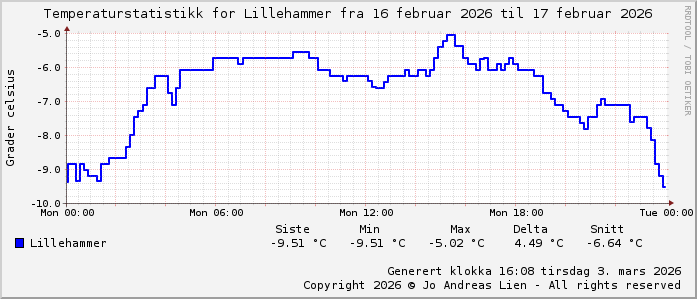 MinTemp -9.3°C (01:25) MaxTemp -5.0°C (15:25) MiddelTemperatur -7.2°C GjennomsnittsTemp -6.6°C (143 avlesninger) Målt på Lillehammer av joli Navnedag: Jill, Juliane, Julian Stjernetegnet er Vannmannen ![]() Kinesisk år er