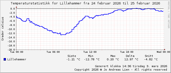 MinTemp -12.8°C (07:25) MaxTemp 0.2°C (19:45) MiddelTemperatur -6.3°C GjennomsnittsTemp -4.8°C (143 avlesninger) Målt på Lillehammer av joli Navnedag: Mats, Mattias, Mattis Stjernetegnet er Fiskene ![]() Kinesisk år er
