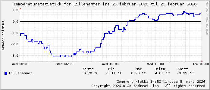 MinTemp -3.1°C (06:55) MaxTemp 0.9°C (21:55) MiddelTemperatur -1.1°C GjennomsnittsTemp -1°C (143 avlesninger) Målt på Lillehammer av joli Navnedag: Viktor, Viktoria Stjernetegnet er Fiskene ![]() Kinesisk år er