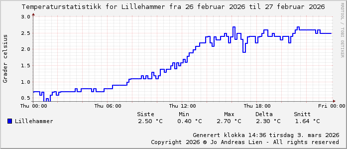 MinTemp 0.4°C (01:05) MaxTemp 2.7°C (16:15) MiddelTemperatur 1.6°C GjennomsnittsTemp 1.6°C (143 avlesninger) Målt på Lillehammer av joli Navnedag: Inger, Ingjerd Stjernetegnet er Fiskene ![]() Kinesisk år er