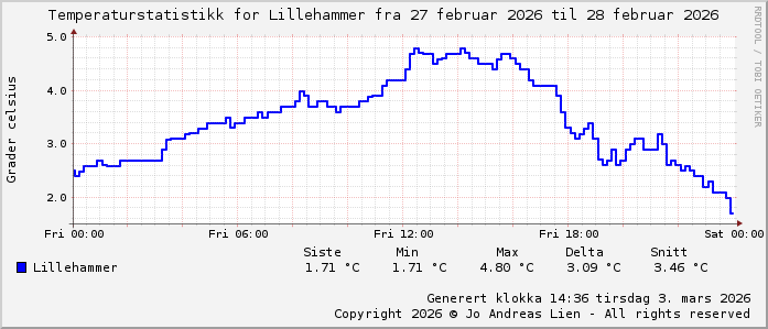 MinTemp 2.0°C (23:55) MaxTemp 4.8°C (12:35) MiddelTemperatur 3.4°C GjennomsnittsTemp 3.5°C (143 avlesninger) Målt på Lillehammer av joli Navnedag: Laila, Lill Stjernetegnet er Fiskene ![]() Kinesisk år er