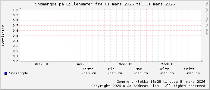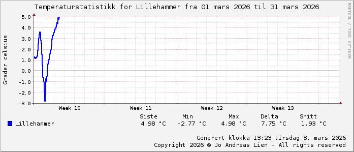 | Laveste temperatur | -3.3°C | 03:05 mandag 02 mars | -8.0°C | 07:15 torsdag 13 mars | -7.1°C | 06:35 tirsdag 12 mars |