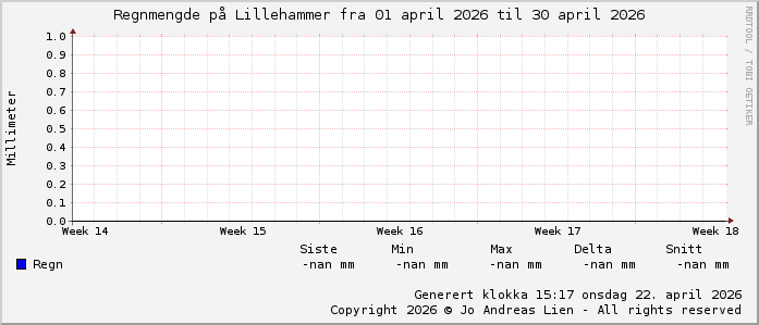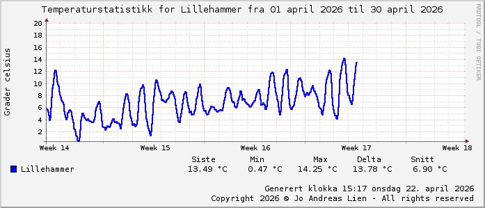 | Høyeste temperatur | 14.4°C | 18:25 tirsdag 21 april | 15.9°C | 16:35 mandag 28 april | 13.9°C | 18:25 fredag 12 april |